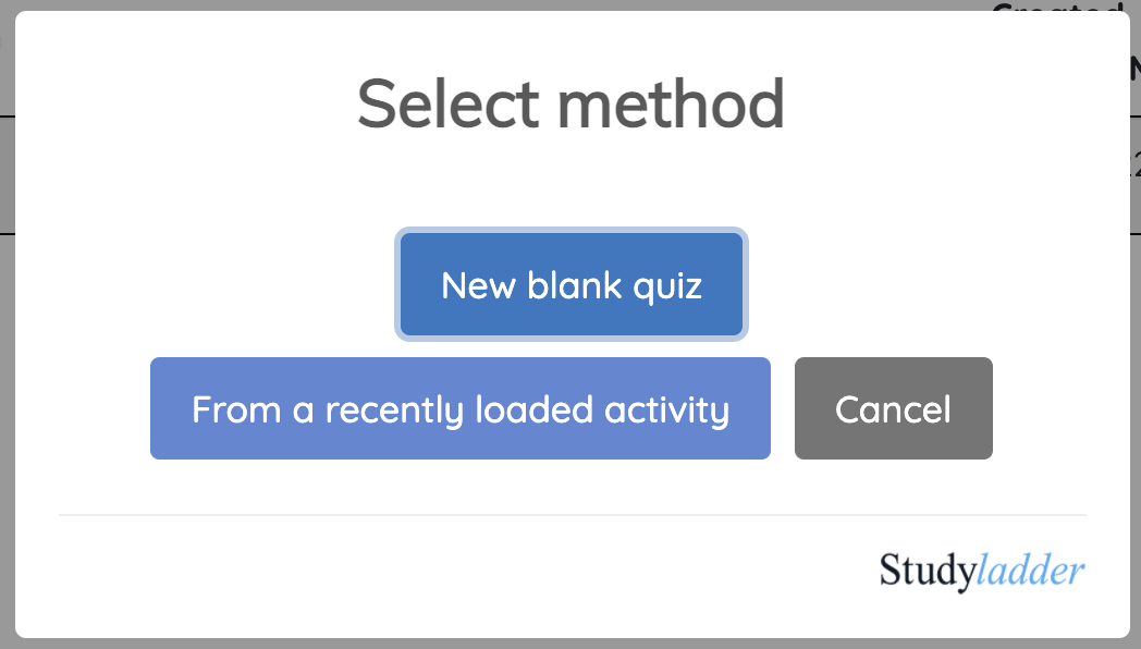 You can choose to create a new quiz from scratch (New blank quiz), or create one from an activity you have recently loaded. Choosing this last option will automatically generate all of the questions and answers and copy in any images.